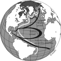 Nicméně, jak už je to v klimatologii obvyklé, neexistuje jednoduchý vztah mezi průběhem Golfského proudu a počasím v Evropě. Klimatický systém má – alespoň v tomto dělení – tři části. Řídícím mechanizmem je množství slunečního záření, které závisí jednak na vnitřní dynamice Slunce (zejména 22letý cyklus), jednak na pozici Slunce a Země (180letý cyklus a delší Milankovičovy cykly). Druhou úrovní je ukládání tohoto tepla oceány a třetí úrovní je přenos oceánského, původně solárního tepla na pevninu. Pro klima střední Evropy je stejně důležitá teplota oceánu jako intenzita západních větrů, které k nám toto teplo (a vlhko) přinášejí. Na to se dá okamžitě namítnout, že síla větrů pochopitelně závisí na teplotě mořské hladiny, ale tím opět vstoupíme do světa kauzálních vztahů, na který jsme chtěli zapomenout. Otázku, zda dřív byla klimatická slepice, nebo klimatické vejce, řešit nebudeme.