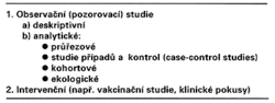 Epidemiologie je obor, který se zabývá rozložením nemocí v populaci a studuje faktory, které toto rozložení určují. K tomu slouží epidemiologické studie (obrázek): Deskriptivní studie popisují rozložení nemoci či jiných se zdravím souvisejících jevů v populaci. Analytické studie se zabývají vztahem mezi potenciálními determinantami nemocí (rizikovými faktory) a zdravotním stavem. Deskriptivní a analytické studie nezasahují do přirozeného běhu věcí, a proto se nazývají observační (pozorovací). Naproti tomu intervenční studie jsou založeny na aktivní změně expozice (např. změně diety) a vyhodnocení účinků této změny na zdravotní stav.Ekologické studie, kterým se budeme věnovat, jsou tedy jen jedním (a spíše výjimečným) typem analytické studie. Je důležité si uvědomit, čím se ekologické studie liší od ostatních typů studií. Zatímco ve všech ostatních studiích je základní jednotkou analýzy jednotlivec, v ekologických studiích je to skupina osob, např. populace okresů či států. (V této souvislosti je tedy slovo ekologické ekvivalentem pojmu skupinové .) To ilustrují grafy č. 1 a 2. Na prvním grafu je zaznamenán vztah mezi obezitou a krevním tlakem u mužů ve věku 45 - 54 let, jak byl zjištěn v individuální studii v 6 okresech ČR; každý bod na grafu odpovídá jednomu jednotlivci. Na druhém grafu je znázorněn typický příklad ekologické studie: vztah mezi průměrnou roční koncentrací polétavého prachu a kojeneckou úmrtností v okresech ČR r. 1987; na tomto grafu jsou údaje o úmrtnosti velkého množství jednotlivců i znečištění v celém okrese agregovány do jediného čísla a každý bod odpovídá jednomu okresu. Tato charakteristika ekologických studií je velmi důležitá a vrátíme se k ní později.