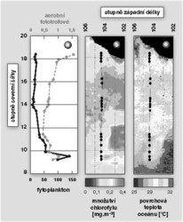 Nejdůležitější místo v mořském ekosystému zaujímají fotosyntetické mikroorganizmy, nazývané souborně fytoplankton. Využívají světelné záření jako základní zdroj energie, vážou oxid uhličitý do organických sloučenin a produkují kyslík (o fotosyntéze viz Vesmír 75, 33, 1996/1). Odhaduje se, že mořský fytoplankton vyrobí ročně asi 45 až 55 Pg (petagramů, 1 Pg je 1015 gramů) organického uhlíku, tedy přibližně stejné množství jako suchozemské rostliny (viz tabulku). Na této produkci organického uhlíku jsou závislé téměř všechny ostatní formy života v oceánu, heterotrofní bakterie, archea a eukaryonta. 1)