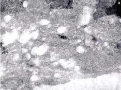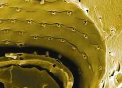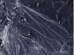 Fosilní hmyz v jantaru lze také studovat v elektronových mikroskopech. Mechanickým otevřením jantaru s fosilní inkluzí obnažíme povrchové nebo i lomové (např. na obrázku 6) struktury, které pak můžeme dobře zkoumat v rastrovacím elektronovém mikroskopu. Pryskyřice přetvořená v jantar zachovala i části tkání. Nejsou sice zachovány ideálně, ale některé jejich komponenty lze zřetelně rozeznat. Obrázky 2 a 3 představují část kutikuly s epidermis v transmisním elektronovém mikroskopu – rozeznatelné jsou vakuoly dvou typů a tubulární struktury, které by mohly představovat drsné endoplazmatické retikulum.