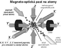 Typické uspořádání magneto-optické pasti vidíme na obrázku. Tři dvojice paprsků (XX, YY a ZZ) z kontinuálního laditelného laseru přicházejí ve směru tří navzájem kolmých os do jednoho místa, kam je také směřován proud atomů. Ve znázorněném uspořádání je navíc jeden laserový paprsek namířen přesně proti proudu přilétajících atomů a má za úkol zpomalovat atomy, vytvářet proti jejich pohybu radiační tlak. Laserové záření působí na atomy pomocí chladicích mechanizmů popsaných na s. 10 a 11, samo však nevytváří dosti účinnou (hlubokou) past na atomy. Proto se přidává nehomogenní (prostorově proměnné) magnetické pole s intenzitou klesající směrem do středu pasti (takové pole lze jednoduše vytvořit dvěma cívkami protékanými proudem v opačných směrech). Magnetické pole interaguje s magnetickým momentem atomů, atomy jsou posouvány do rezonance s laserovým zářením a výsledkem je síla, která je vrací do středu pasti. Tak vzniká neviditelná hradba proti úniku atomů z pasti. V posledních letech bylo pro atomové pasti navrženo a realizováno složitější magnetické pole, s jehož pomocí byly dosaženy rekordně nízké teploty nižší než 1 mikrokelvin (miliontina kelvinu) plynu atomů (viz Rekordně nízká teplota, Vesmír 75, 32, 1996/1).