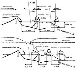 Letecká katastrofa 11. 2. 1977. Kritický úsek v předpolí dráhy letiště Bratislava-Ivanka je závislý na směru větru, pro obr. 3 byl akční směr 340°. Opačný okraj severozápadního sektoru, tedy 290° (obr. 4), vyvolává podobný efekt v severním předpolí přistávací dráhy č. 22. A právě tato okolnost se zřejmě podílela na letecké katastrofě kapitána R. Chládka (Av-14). Šetření a soudní řízení ukázalo (navzdory negativnímu postoji meteorologického úřadu) význam místních dynamických změn tlaku v mezích plus minus 8 hPa na vzdálenost 23 km. Právě výsledný účinek dvou systémů aktivní turbulentní vrstvy a řízeného sestupu navedl Chládkovo letadlo ku kritickému druhému kilometru (obr. 4).
