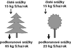 Depozice kyselých atmosférických látek je nižší v listnatých lesních ekosystémech než v ekosystémech jehličnatých. Proč? Kyselé látky nevstupují do ekosystému jenom s deštěm (mokrá depozice), ale kromě toho se plyny a aerosolové částice přenášené vzduchem zachycují na povrchu předmětů (suchá depozice). Čím větší povrch, tím více plynů a pevných částic se na něm zachytí. Jehličnany mají oproti listnáčům výrazně větší povrch i ve vegetačním období, natož pak v době vegetačního klidu. Horské smrkové monokultury působí jako účinné „kartáče“. Suchá depozice síry tvoří dnes na našem území zhruba polovinu až dvě třetiny celkové depozice a je rozhodujícím faktorem okyselování zalesněných oblastí (viz obr.). Suchá depozice dusíku tvoří 10 až 50 % celkového vstupu dusíku do ekosystému, přičemž její podíl v posledních letech roste.
