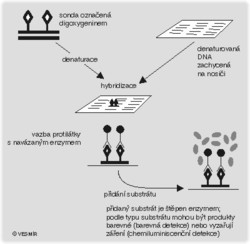 - Do molekuly DNA vložíme nukleotidy spojené s nějakou velkou, nápadnou molekulou, dobře rozeznávanou specifickými protilátkami. V dnešní době se k tomu velmi často používají nukleotidy s navázaným digoxygeninem, což je látka získaná z náprstníku (Digitalis).