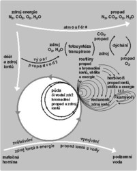 reálné časoprostorové znázornění komplexity ekosystému je zatím neproveditelné. Pouhým přiblížením k realitě jsou nesčetné modely ekosystémů (viz obrázek 1 a obrázek 2), zjednodušeně ukazující hlavní abiotické zdroje a biotické aktéry (v podobě dílčích bloků, kompartmentů) a hlavní přenosy energie, látek či informací (v podobě šipek). 17)