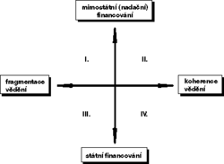 V případě české vědy jsme nejčastěji uvažovali o dvou svazcích nejistot – první se týkal financování a druhý stavu společnosti. Osy je vždy nutné označit různými slovy – např. osa „málo peněz — hodně peněz“ nám problém neúnosně redukuje. V případě peněz je adekvátnější volit osu například ve znění: státní financování – nadační financování. V případě stavu společnosti jsme měli na výběr z několika podobných parametrů: otevřená – uzavřená společnost, základní – aplikovaný výzkum, ale nakonec jsme pro konkrétní případ CTS volili následující osy: