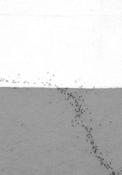 Díky J. Oettlerovi a kol. nyní víme, že stejně se chovají i mravenci. Výzkumníci vypustili mravence Wasmannia auropunctata (neoblíbený invazivní druh) přes můstek do jednoho rohu obdélníkového krmítka. V protilehlém rohu byl dostatek chutných švábů. Krmítko obsahovalo dva pásy odlišného povrchu: hladký polyethylen, po kterém se běhá jedna báseň, a filc, kde se malým mravencům zaplétají nožičky mezi chlupy. Po několika dnech se vytvoří známá mravenčí cestička značená feromony. Nevede však po přímce, ale po lomené čáře přibližně minimalizující čas dosažení cíle.