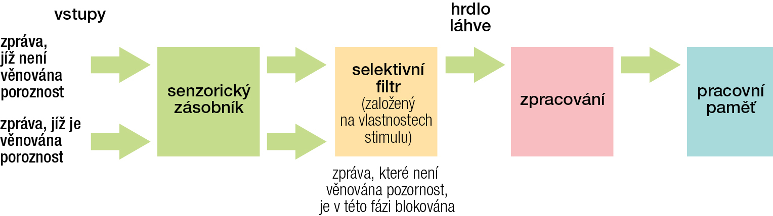 První vlivný model pozornosti navrhl roku 1958 britský psycholog Donald Broadbent. Ve své teorii předpokládal, že senzorické informace nejprve krátce setrvají v jakémsi senzorickém „skladu“ a následně je filtr pozornosti vybere k dalšímu zpracování v systémech vyššího řádu (obr. 1). K vnímání a vědomí se tedy dostává jen poměrně malá část senzorických vstupů, ostatní informace zůstanou zachyceny v nižších patrech zpracování smyslové informace a jsou pro další zpracování ztraceny.