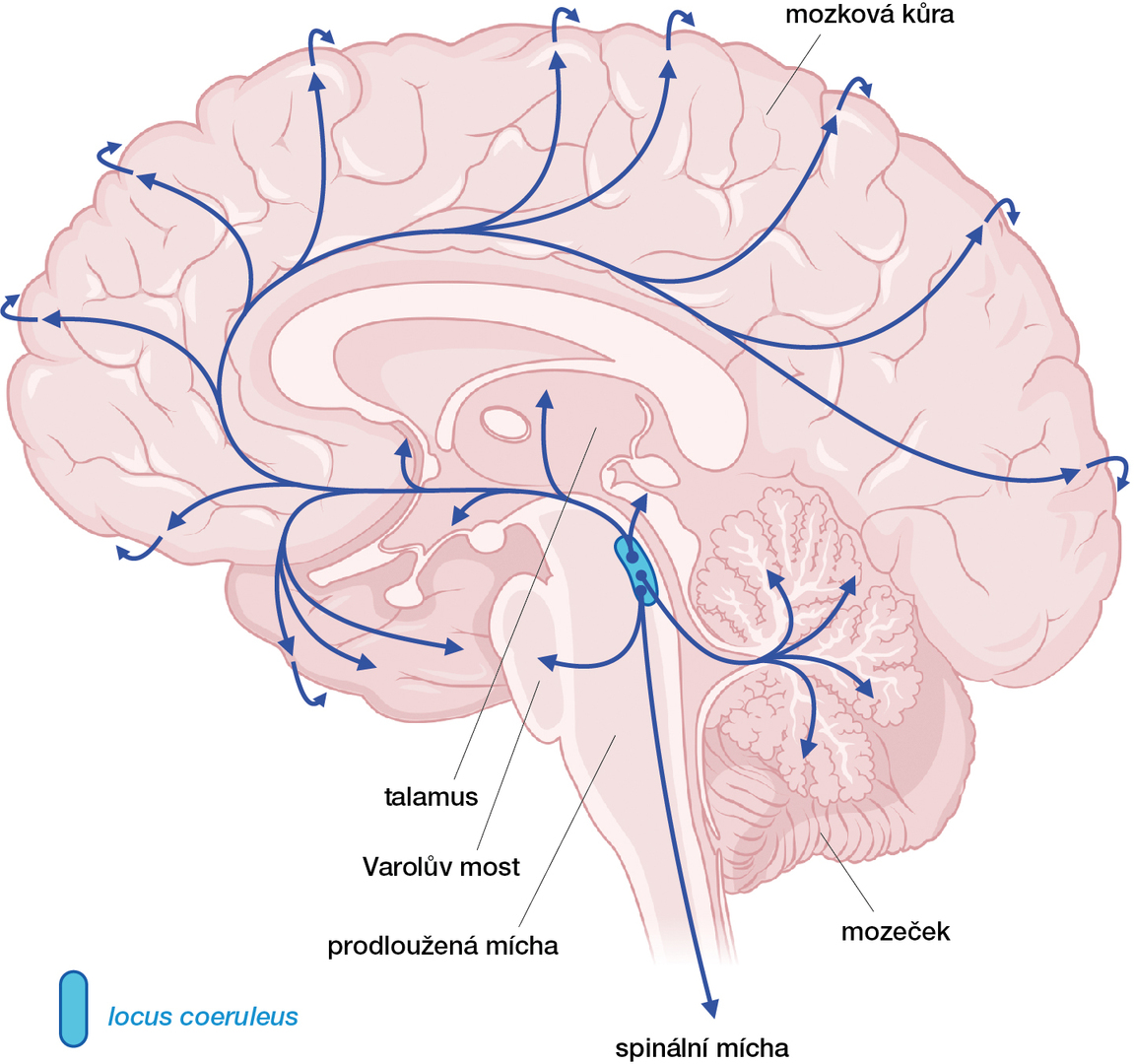 Síť bdělosti udržuje organismus v optimální pohotovosti a připravenosti reagovat. Zásadní roli v této funkci hraje neuropřenašeč a neuromodulátor noradrenalin. Klíčovým uzlem sítě je jádro locus coeruleus v mozkovém kmeni, což je také hlavní zdroj noradrenalinu v mozku (obr. 2). Z této drobné, ale důležité struktury se noradrenergní vlákna rozbíhají difuzně do všech „koutů“ mozku: kortexu, limbického systému, hypotalamu, mozečku i mozkového kmene. Aktivace této sítě zvyšuje pozornost, bdělost a reguluje učení a paměť; zejména když přichází významný signál. Síť bdělosti tak hlídá připravenost mozku reagovat na signály, které mohou přijít z různých míst.