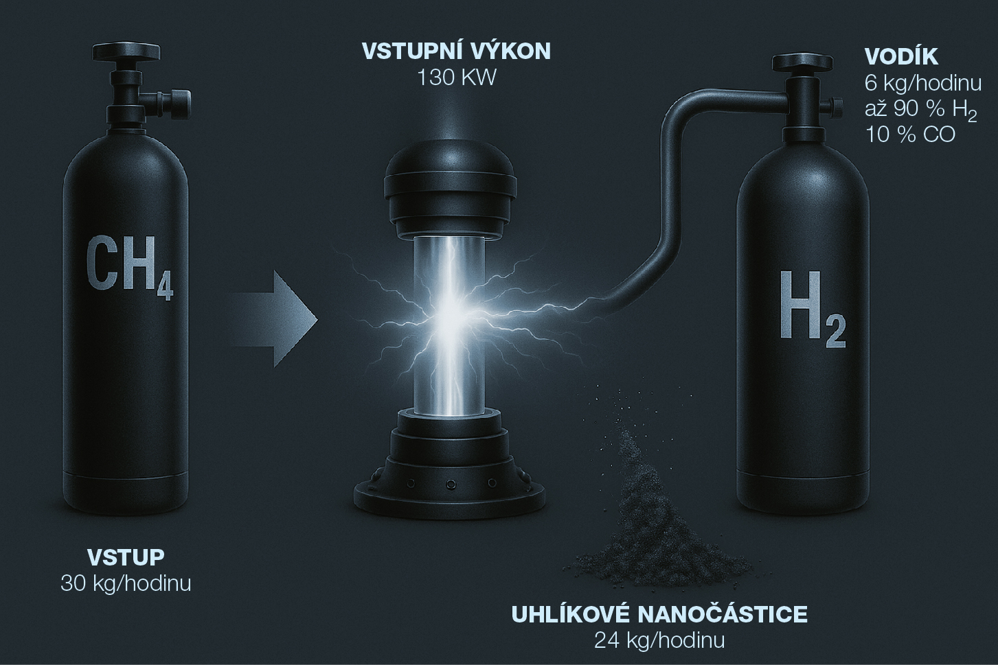 V laboratorních podmínkách bylo při vstupním výkonu 130 kW do plazmového reaktoru možné za jednu hodinu přeměnit 30 kg metanu na 6 kg vodíku a 24 kg uhlíkových nanočástic. To odpovídá přibližně 90% přeměně vstupního uhlíku do pevné formy a velmi efektivnímu výtěžku vodíku, který se uvolňuje v plynné fázi spolu s oxidem uhelnatým. Výsledný syntézní plyn tak může obsahovat až 90 % vodíku a zbylých 10 % CO. Pokud se na tuto reakci podíváme z energetického hlediska, tak na vstupu máme během jedné hodiny kolem 550 kWh (kombinace výhřevnosti a plazmové technologie), zatímco energetický výstup ve formě produktů jako vodík, oxid uhelnatý a uhlík činí zhruba 420 kWh. Část energie plazmatu se transformuje na teplo, které lze zčásti dále využít, avšak jisté energetické ztráty jsou nevyhnutelné. Pro srovnání – přímé spalování stejného množství metanu by generovalo přibližně 400 kWh využitelné energie. I při takovýchto energetických rozdílech může celková ekonomická bilance hrát ve prospěch plazmatu. Rozhodujícími faktory jsou nulová uhlíková stopa (při plazmovém procesu nevzniká CO2) a také komerční hodnota vodíku a uhlíkových nanočástic. Výzvou však zůstává vysoká energetická i investiční náročnost plazmových procesů. Pro dosažení extrémních teplot je nutný značný příkon elektrické energie, což zvyšuje provozní náklady. Kromě toho je konstrukce plazmových hořáků, reaktorů a systémů pro chlazení či sběr produktů technologicky složitá a finančně nákladná. Tyto faktory často limitují nasazení plazmových reaktorů na průmyslové úrovni, pokud není zajištěna dostatečná ekonomická návratnost například prodejem vysoce hodnotných vedlejších produktů, jako jsou uhlíkové nanomateriály.