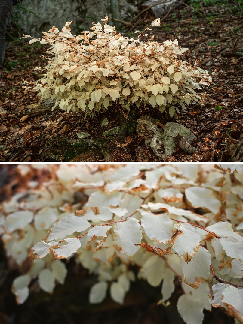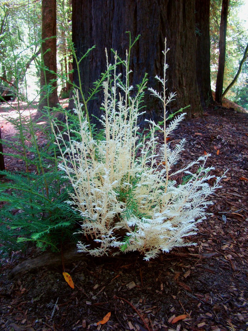 Známé jsou i případy bílých větví sekvojí, citrusů nebo jmelí či bílé části klonálních rostlin, které přežívají více let díky spojení s mateřskou rostlinou. V hlubokých lesích Kalifornie se občas objeví záhadný přírodní úkaz – bílo-zelené chiméry, bílé výhony na jinak sytě zelených sekvojích (Sequoia sempervirens). Vzácně i celý bílý jedinec. První zmínky o těchto podivných stromech jsou v publikacích z poloviny 19. století. Vzácný jev je výsledkem genetické mutace, která brání tvorbě chlorofylu, a nutí tak bílou část rostliny, aby se živila z cukrů produkovaných zdravou, zelenou částí téhož jedince. Byl to i případ stromu popsaného v úvodu.