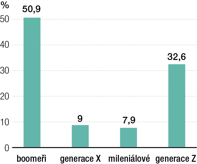 Pokud se v České republice lidí ptáme, zda patří do sociální skupiny, která je ve společnosti diskriminovaná, nejčastěji zmiňují svou věkovou skupinu. [2] Na základě věku nejvíce cítí diskriminaci příslušníci generace baby boomerů (1946–1964) následovaní generací Z (1997–2012). Mezi lidmi, kteří se cítí být diskriminovaní na základě věku, tvoří boomeři téměř 51 % a generace Z téměř 33 % (obr. 1). Ageismus – symbolická i reálná stereotypizace a diskriminace osob a skupin na základě jejich chronologického věku anebo na základě jejich příslušnosti k určité generaci – postihuje mladé i starší lidi. Ageismus vůči mladým lidem se projevuje v mnoha oblastech, jako je trh práce, přístup ke zdravotní péči, dostupnost bydlení a možnost zapojit se aktivně do politiky. Ageismus vůči starším lidem (50+) se projevuje zejména na trhu práce.