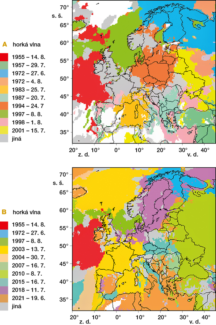 Příkladem takového plošného pohledu je práce, která studovala proměnlivost a trendy horkých vln napříč Evropou. [2] Zatímco v období 1950–1989 se roční počet horkých dní pohyboval převážně v rozmezí 0–20, od devadesátých let 20. století se jejich četnost postupně zvyšuje. V letech 2003, 2010, 2015, 2018 a 2021 přesáhl počet těchto dnů 50. Tento nárůst a související zvyšování extremity horkých vln způsobily, že mapa rekordních událostí dnes vypadá úplně jinak než na počátku 21. století – za posledních 20 let došlo k překreslení více než 80 % plochy evropského kontinentu a přilehlých moří (obr. 1). Pro naše území je jako dosud nejextrémnější vyhodnocena horká vlna z roku 2015, přičemž další zmíněné extrémní roky lze na mapě také vysledovat – na západ od nás horkou vlnu z léta 2003, na sever 2018, na východ 2010, na jih 2021.