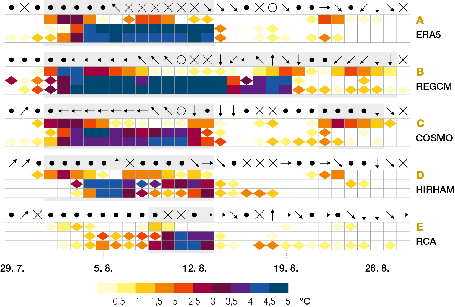 Jak jednotlivé regionální klimatické modely zachycují mimořádnou horkou vlnu z roku 2003 (v oblasti střední Evropy), ukazuje obr. 3. V referenčních datech z klimatické reanalýzy ERA5 (data blížící se skutečnému pozorování; obr. 3A) začala tato horká vlna 1. srpna za přítomnosti tlakové výše kladnými teplotními odchylkami ve vyšší troposféře. Po pěti dnech došlo ke změně synoptických podmínek – nejdříve byly charakterizovány jihovýchodním prouděním a následně došlo ke vzniku nevýrazného tlakového pole, s čímž souvisely intenzivní a plošně rozsáhlé kladné teplotní odchylky v nižších hladinách troposféry, které vydržely až do 13. srpna. Všechny validované modely správně vystihly přítomnost tlakové výše na začátku horké vlny, nicméně její další vývoj se v různých modelech lišil, přestože byly řízeny stejnými vstupními daty. Ty modely, které hned druhý nebo třetí den upřednostnily východní proudění (REGCM a COSMO; obr. 3B–C), simulovaly horkou vlnu 2003 jako příliš intenzivní a v případě modelu REGCM i velmi dlouhou. Naopak modely, v nichž zůstávala tlaková výše nad střední Evropou i v pokročilé fázi horké vlny, nedokázaly vytvořit dostatečně intenzivní a plošně rozsáhlé kladné teplotní odchylky v nižších hladinách troposféry (HIRHAM, RCA; obr. 3D–E).