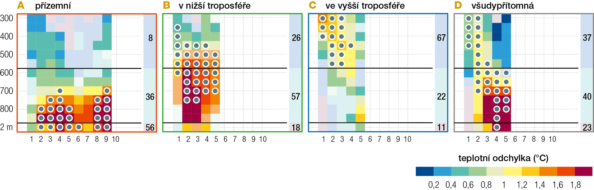 Druhou kategorií jsou horké vlny v nižší troposféře (obr. 2B). Největší kladné teplotní odchylky v rámci tohoto typu převládají v izobarických hladinách zhruba mezi 750 a 550 hPa (tj. ve výškách asi 3 až 5 km). Horké vlny v nižší troposféře bývají kratší a souvisejí převážně s přílivem velmi teplého vzduchu od jihu. Třetí typ (obr. 2C) je charakterizován kladnými teplotními odchylkami ve vyšší troposféře, přibližně od 500 do 300 hPa (zhruba 5,5 až 9 km). Horké vlny ve vyšší troposféře jsou v průměru nejkratší a jsou spjaty hlavně s adiabatickým ohříváním vzduchových hmot ve vyšších hladinách z důvodu sestupných pohybů v oblasti vysokého tlaku vzduchu nad střední Evropou.