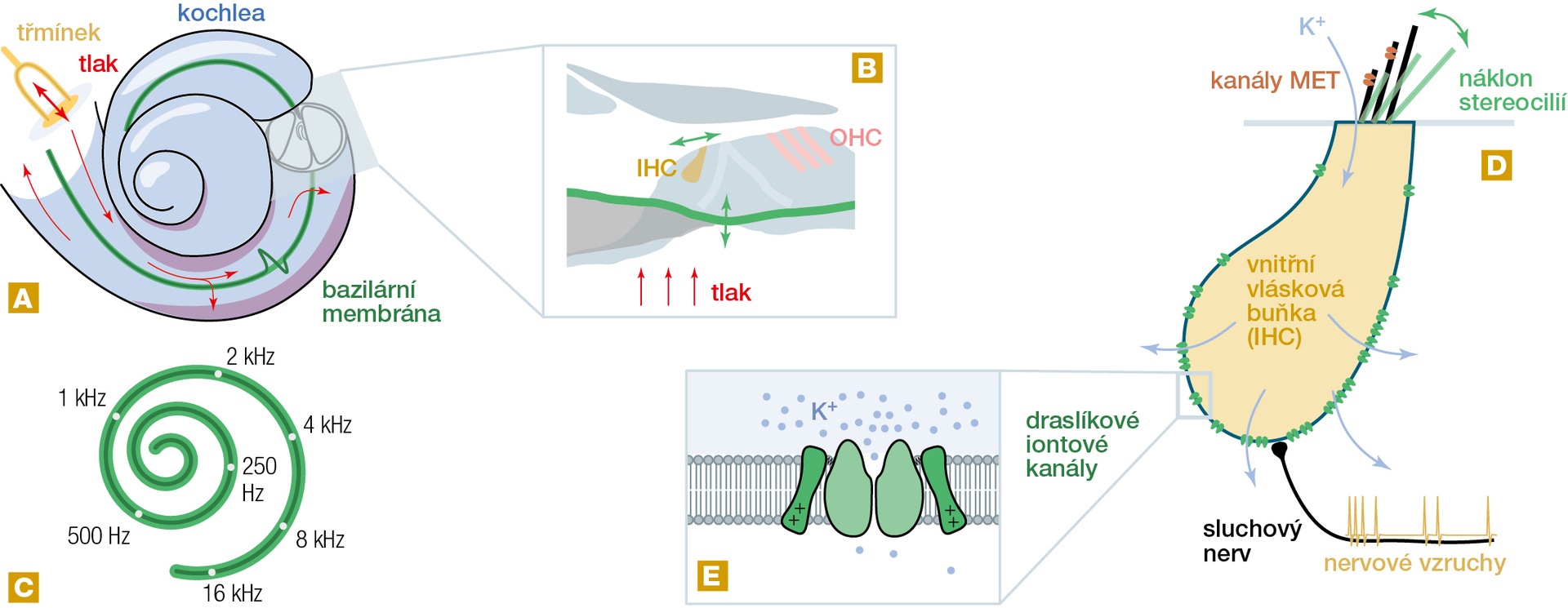 Výše zmíněný Mistríkův elektrický model Cortiho orgánu v hlemýždi vnitřního ucha byl pro nás dobrý výchozí bod, protože v procesu slyšení hrají hlavní roli ionty, elektrická napětí a proudy. Zvuk je sice mechanické vlnění, ale rozhodnutí, zda se objeví akční potenciál, padá na úrovni iontových proudů skrz membránu. Buněčná membrána je polopropustná bariéra, která udržuje na každé straně odlišné koncentrace draslíku (K+), sodíku (Na+), chloridů (Cl–) a dalších iontů. Typická buňka má uvnitř relativně vysoké koncentrace K+ a nízké Na+ (vně buňky je to naopak) a klidové napětí řádově −60 až −80 mV. Vnitřní ucho má ale jedinečné prostředí. Mechanosenzitivní části senzorických vláskových buněk (IHC a OHC, viz rámeček) jsou vystaveny endolymfě, což je extracelulární tekutina s neobvykle vysokým obsahem K+ a nízkou koncentrací Na⁺, tedy složením obráceným vůči obvyklým extracelulárním tekutinám. Zároveň je zde aktivně udržován kladný potenciál zhruba +80 mV. Díky tomu, když se na apikální straně vláskových buněk otevře mechanosenzitivní iontový kanál (MET), proud K⁺ teče do buňky a vyvolá výraznou depolarizaci. Na bazolaterální straně vláskových buněk je prostředí „normální“ a K+ proudí ven, čímž buňku repolarizuje. Celý proces je tedy řízen elektrickými a chemickými gradienty.