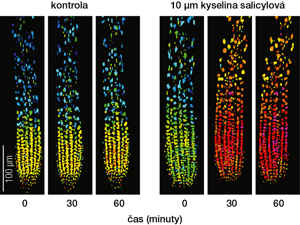 Kyselina salicylová je rostlinný hormon zodpovědný za spuštění imunitní reakce po napadení rostliny patogenem. Senzor vyvinutý na univerzitě v Cambridge umožní sledovat v reálném čase změny v koncentraci hormonu uvnitř buněk. Sestává ze dvou proteinů, které po vazbě na hormon prodělají konformační změny, což se projeví na změnách jejich fluorescence (viz srovnání kontroly a aplikace kysliny salicylové na obr.). Lze tak s vysokou přesností a rozlišením sledovat vznik a šíření imunitní odpovědi rostlinnými pletivy. Spolehlivost senzoru testovaly Tetiana Kalachova a Hana Leontovyčová v Ústavu experimentální botaniky AV ČR, spoluautorky článku v Science.