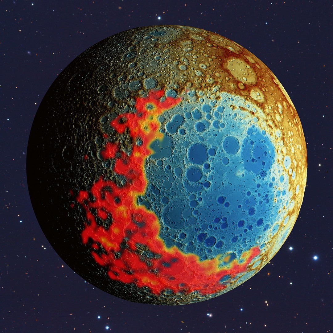 | 3. 11. 2025Až (pokud) přistanou astronauti NASA v rámci programu Artemis u jižního pólu Měsíce (Vesmír 103, 176, 2024/3), budou mít příležitost zkoumat pozůstatky magmatického oceánu, který ještě nestihl zcela zkrystalizovat, když do oblasti před 4,3 miliardy let narazil obří asteroid. Památkou na dávnou srážku je na odvrácené straně Měsíce impaktní pánev South Pole-Aitken o průměru 2500 km. Nový výzkum tvrdí, že asteroid nepřiletěl z jihu, jak se dosud soudilo, ale ze severu. Na jihozápadním okraji pánve odkryl vrstvu, která v té době ležela mezi kůrou a pláštěm. Je bohatá na draslík, prvky vzácných zemin a fosfor (odtud angl. akronym KREEP). Její přítomnost na povrchu signalizuje radioaktivní thorium (na obr. červeně).