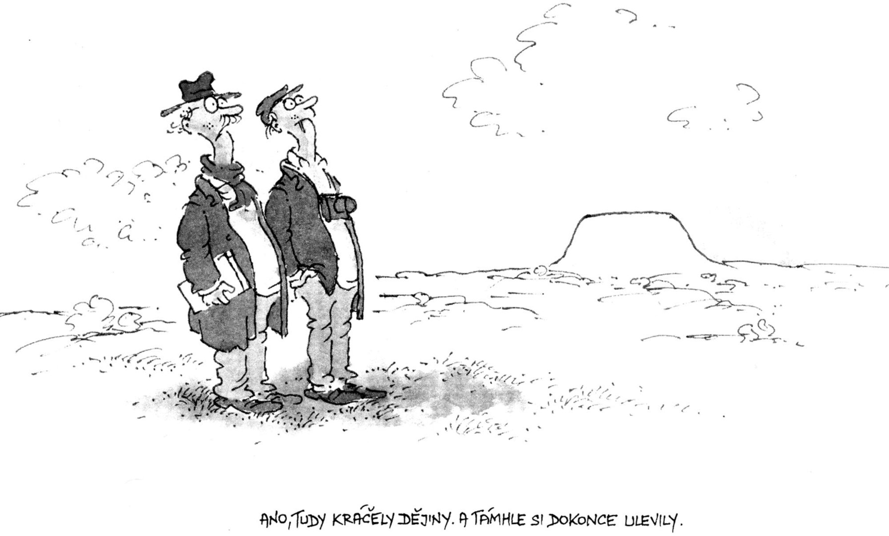 | 1. 12. 2025Chceme-li porozumět dnešnímu světu, a to bychom z řady důvodů chtít měli, bez studia migrací se neobejdeme. Už první zásadní migrace Homo sapiens, expanze z Afriky asi před 70 tisíci lety, navždy proměnila tvář planety. Od té doby se různé lidské skupiny vydaly na cestu nesčetněkrát a z různých příčin. Různě vypadalo i jejich setkání s lidmi, kteří stejnou oblast obývali před nimi. Spolu s lidmi kráčely dějiny se vším, co dějiny obvykle přinášejí. Tak jako na kresbě Vladimíra Renčína. Ta mi ostatně připomněla jiný vtip, také situovaný do okolí Řípu: na obrázku Pavla Kantorka stařešinové se znepokojenými pohledy upřenými k východu přemlouvají medovinou zmoženého praotce Čecha, aby šel ještě o kousek dál.