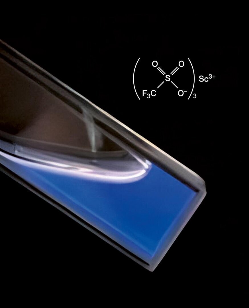 V organické chemii jsou často používané soli trojmocného skandia, zejména trifluormethansulfonát skanditý [Sc(OSO2CF3)3] (obr. 1), který se vyznačuje dobrou rozpustností v organických rozpouštědlech. Tato sůl se používá výlučně jako Lewisova kyselina, tedy látka, která se dobře váže k jiným sloučeninám prostřednictvím jejich atomů s volným elektronovým párem. K interakci dochází prostřednictvím trojmocného skandia a vzniklá vazba má charakter vazby koordinační. Koordinace skanditých iontů způsobuje snížení elektronové hustoty na vázané sloučenině a ta pak snadněji reaguje s nukleofily.