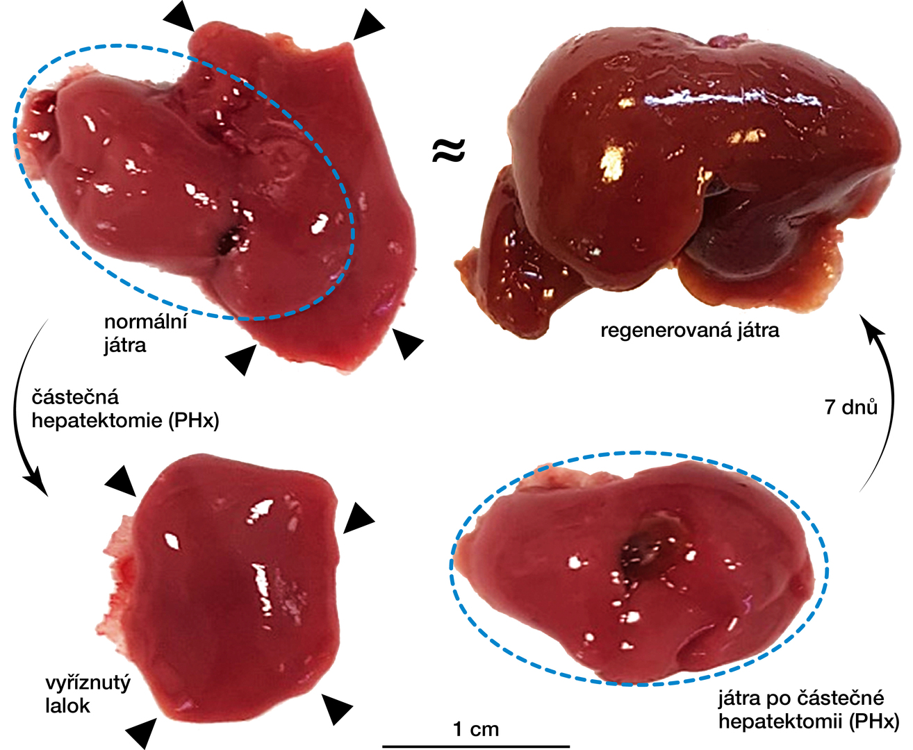 Naše laboratoř molekulární terapie v Biotechnologickém ústavu AV ČR se zabývá nádorovou biologií. V roce 2020 k nám nastoupil Berwini Endaya, můj bývalý doktorand z Griffithovy univerzity v Austrálii (viz Vesmír 101, 524, 2022/9). Původně vystudoval veterinární lékařství, jednou z jeho odborností byla příprava a použití myšího modelu regenerace jater po jejich částečném odstranění (hepatektomii). Regenerující játra se vyznačují velkou rychlostí růstu (proliferací) buněk, zejména hepacytů. Tedy podobně jako nádory, jimž se věnujeme v naší laboratoři. Je zde jeden naprosto zásadní rozdíl: regenerující játra přestanou růst, i když dorostou do původního stavu (vyznačujícího se především počtem jaterních buněk), zatímco nádor roste tak dlouho, dokud není zlikvidován (například léčbou) či dokud nezahubí svého „hostitele“. Proliferace regenerujících jaterních buněk je přitom výrazně vyšší, než je tomu u nádorů, proto lze s nadsázkou označit regenerující jaterní tkáň za „supernádor“, jehož růst se v určité fázi zastaví.