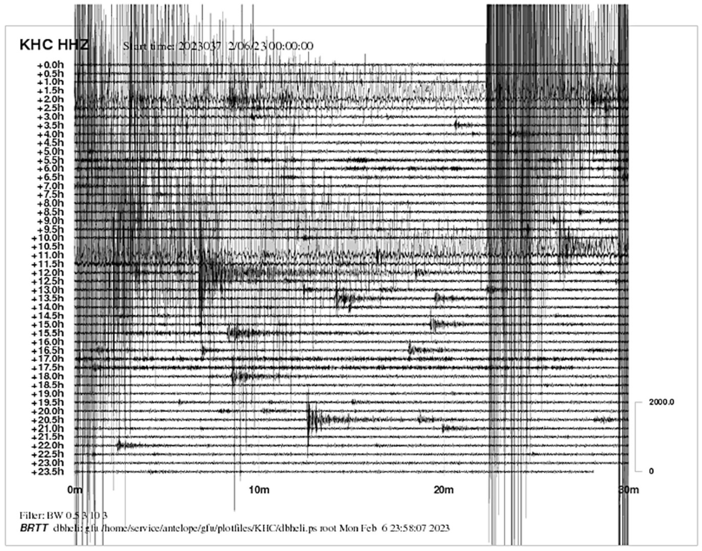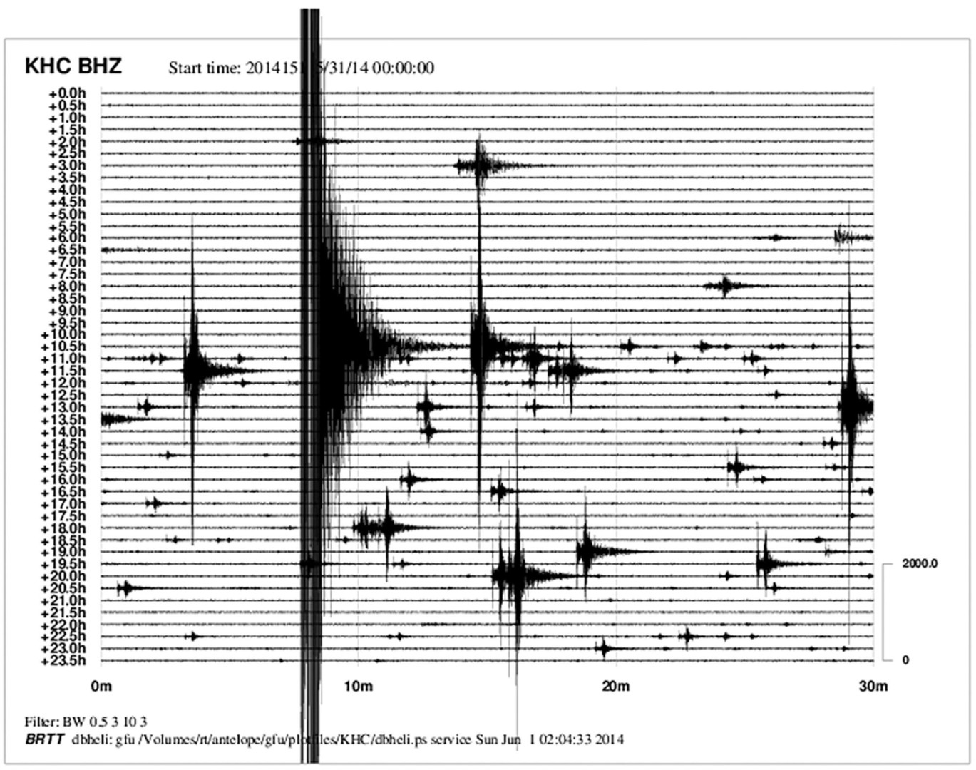 Pro představu, jak seismická stanice KHC – Kašperské Hory funguje a jak vypadají záznamy seismických vln, si prohlédněme denní seismogramy dvou seismických událostí různé intenzity z různých vzdáleností (obr. 1 a obr. 2).