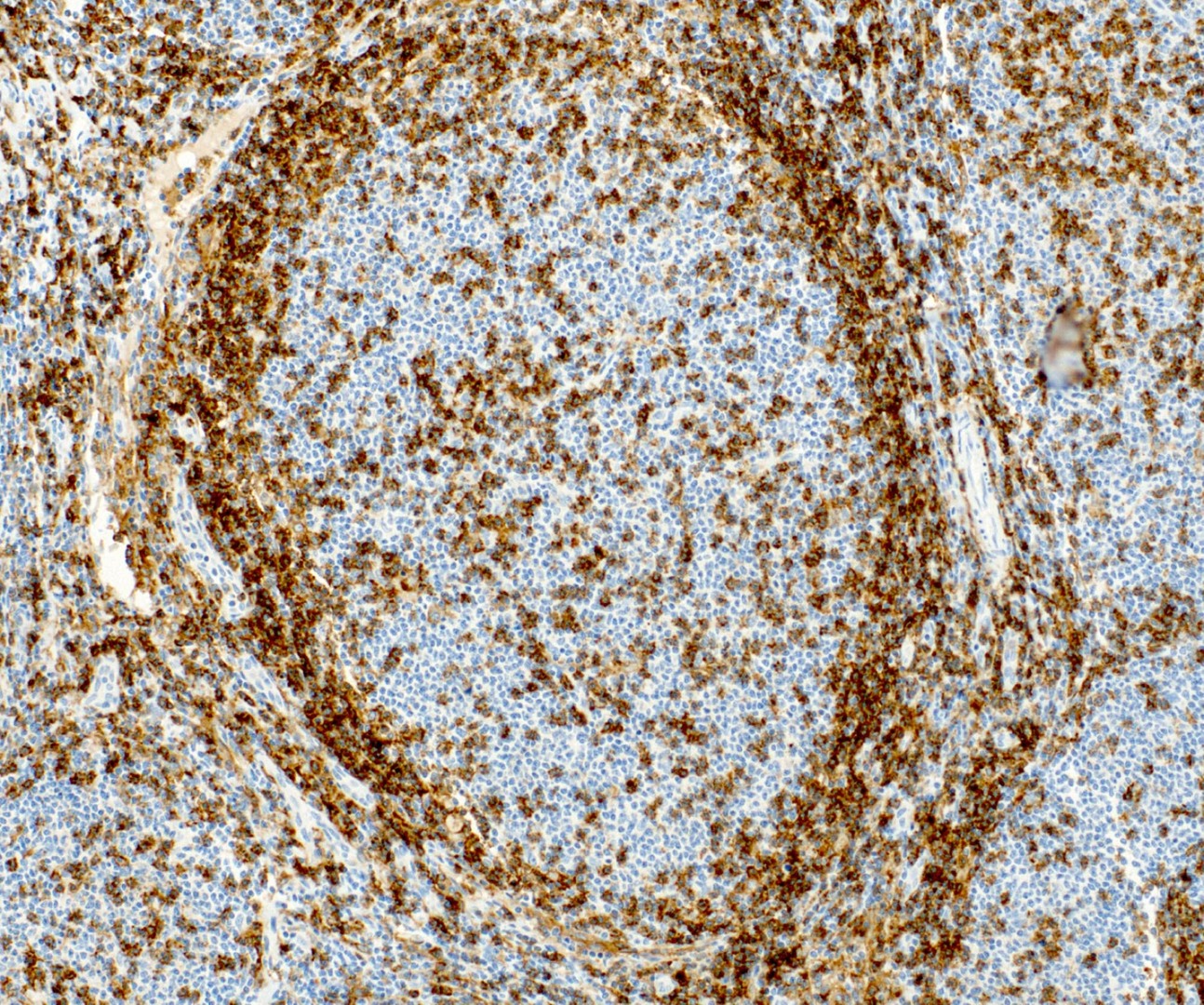 | 30. 3. 2026Tým vedený Markem Mrázem z CEITEC Masarykovy univerzity (Vesmír 105, 131, 2026/3) publikoval článek mapující genetické pozadí proměny pomalu rostoucího folikulárního lymfomu (nádoru mízních uzlin) v agresivní formu. Autoři porovnali profily mRNA a nekódujících mikroRNA u pacientů před a po rozvoji agresivní formy. Zaujal je výrazný úbytek jedné rodiny mikroRNA (miR-29), která plní důležitou roli v regulaci nádorového bujení. Když její množství v buňkách poklesne, naruší se regulační kaskáda, která do té doby držela nádorové buňky na uzdě. Zároveň se ukázalo, že pacienti s počáteční nižší hladinou miR-29 měli horší průběh onemocnění. Měření hladiny této RNA tedy může včas odhalit rizikové pacienty. (Na snímku tvoří nádorem zneužité pomocné lymfocyty T v mízní uzlině ochranný prstenec okolo rakovinných B-lymfocytů.)