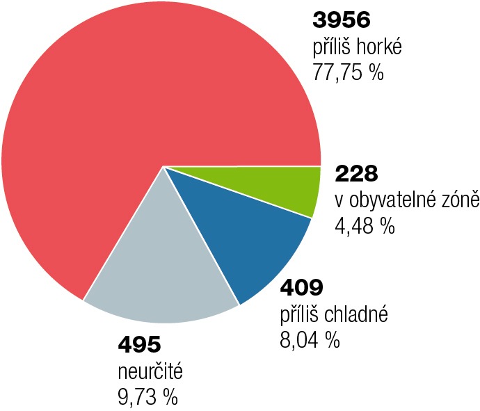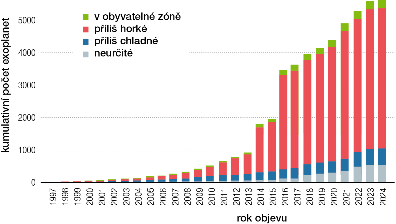 1. Vedle osmi planet, které jsou v naší Sluneční soustavě, je dnes známo více než 6000 exoplanet, které byly detekovány a potvrzeny ve více než 4000 planetárních systémech. První potvrzená exoplaneta byla objevena teprve r. 1992, ale od té doby počet těch nově objevených stoupá exponenciálně (obr. 1). [3] Samozřejmě ne všechny exoplanety jsou vhodné pro život. Musí být v tzv. obyvatelné zóně (habitable zone). Na základě obvykle přijímané definice (viz Důležité termíny a pojmy) se přibližně 4,5 %, tedy více než 200 dosud objevených exoplanet, nachází v obyvatelné zóně svých hvězd (obr. 2). Jestliže je v naší galaxii 100 až 400 miliard hvězd a průměrný počet planet na hvězdu je více než jedna, znamená to, že planet potenciálně obyvatelných alespoň pro jednoduché živé organismy musí být miliony už jen v naší galaxii.