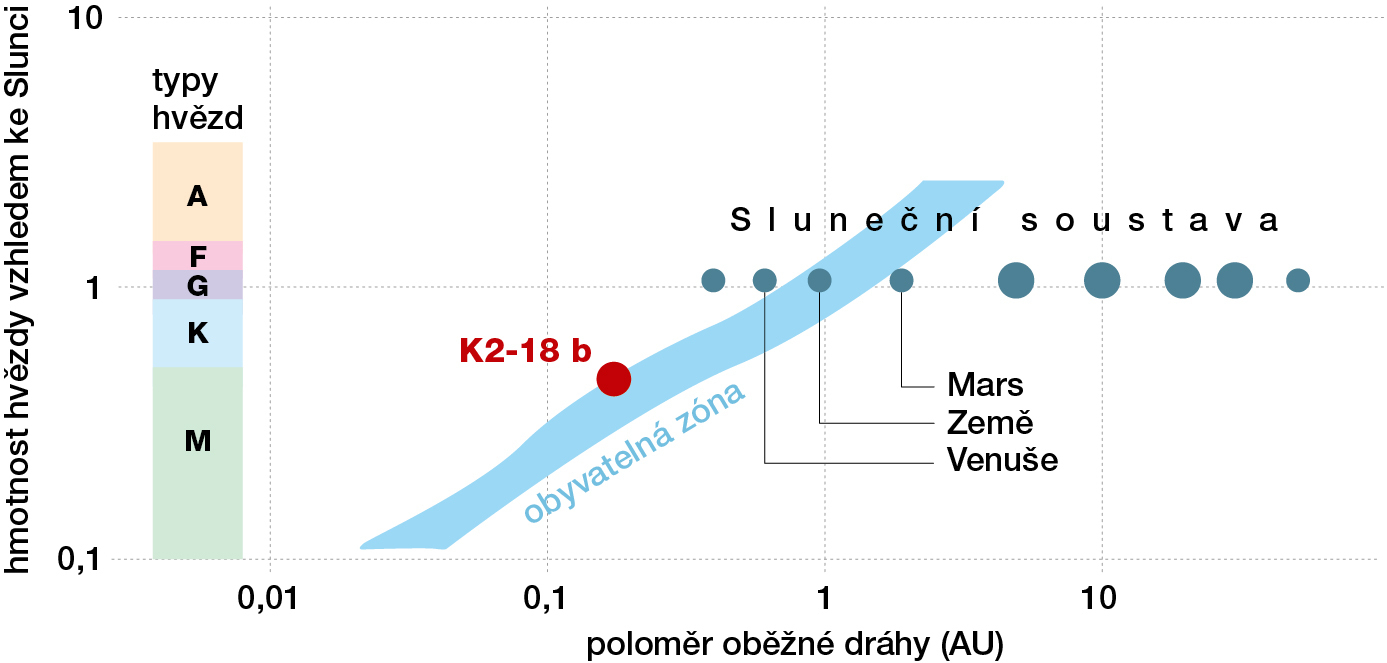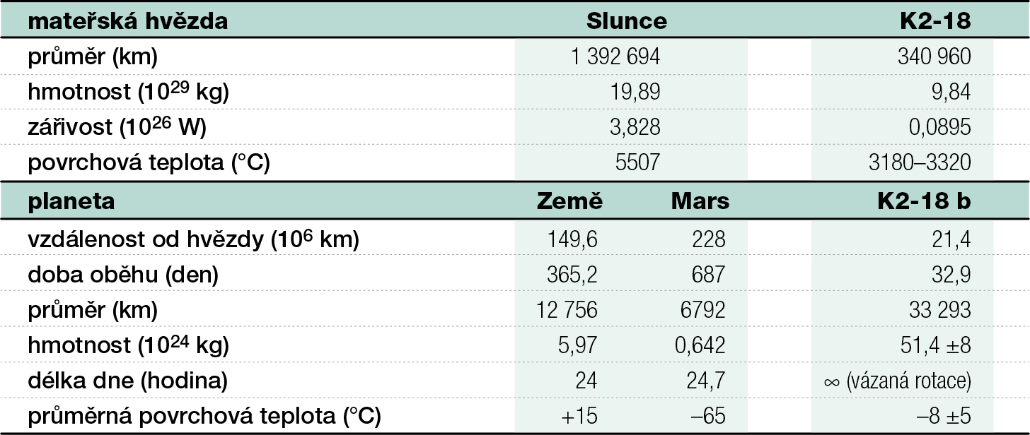 Jednou z exoplanet, která se pravděpodobně nachází v obyvatelné zóně své hvězdy, je K2‑18 b (obr. 3). Obíhá okolo nenápadné hvězdy – červeného trpaslíka K2-18 –, situované na naší obloze v souhvězdí Lva. K2-18 b je vzdálena od Země 124 světelných let a klasifikována je jako „sub-Neptun“ (planeta větší než Země, ale menší než Neptun). Důsledkem jejích základních charakteristik (srovnání se Zemí a Marsem viz tabulku I) je příkon záření velice podobný tomu, jaký získává Země od Slunce. Protože je K2-18 chladnější než naše Slunce, je obyvatelná zóna mnohem blíže hvězdě a rok na planetě K2-18 b trvá přibližně jeden měsíc, což umožňuje pozorovat více tranzitů během jediného pozemského roku.
