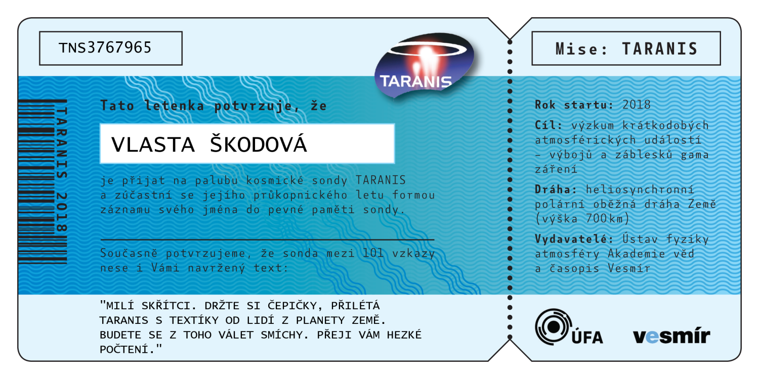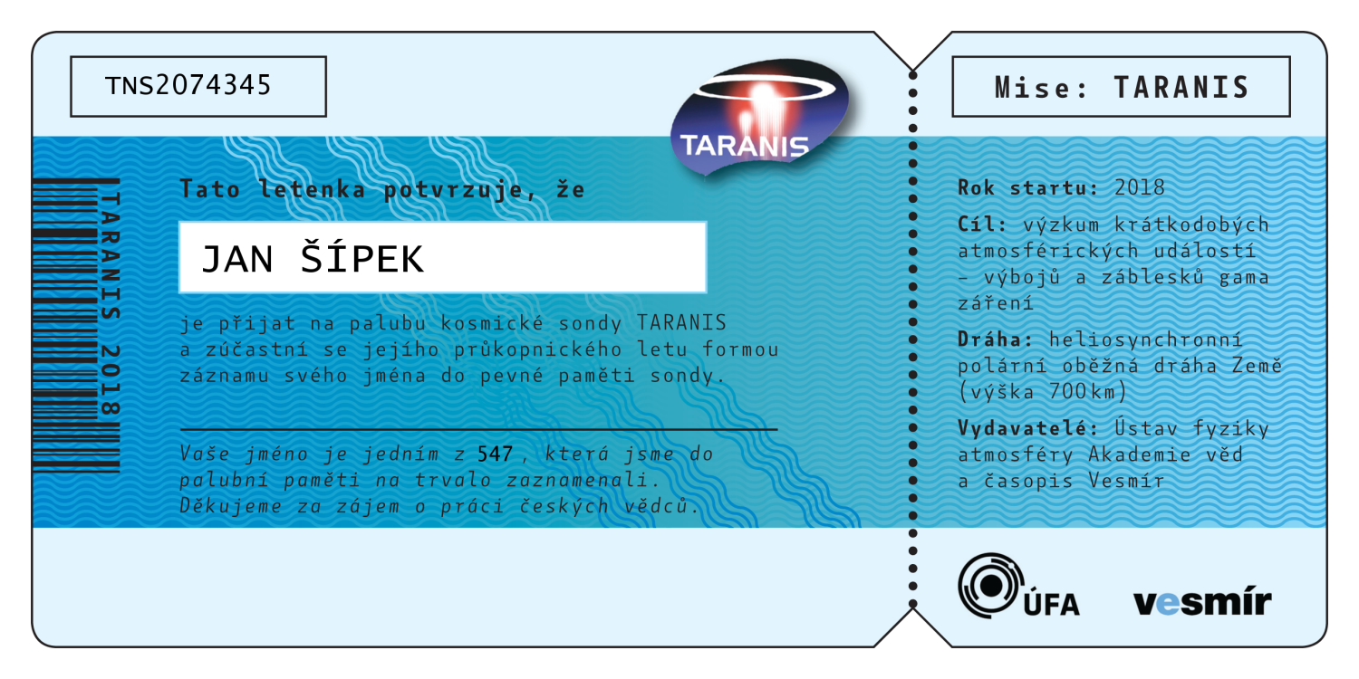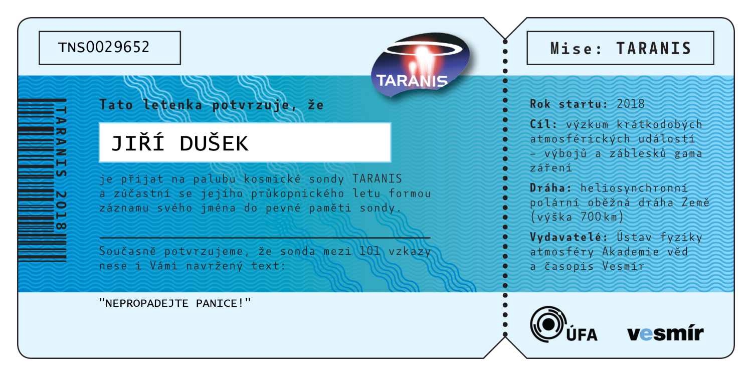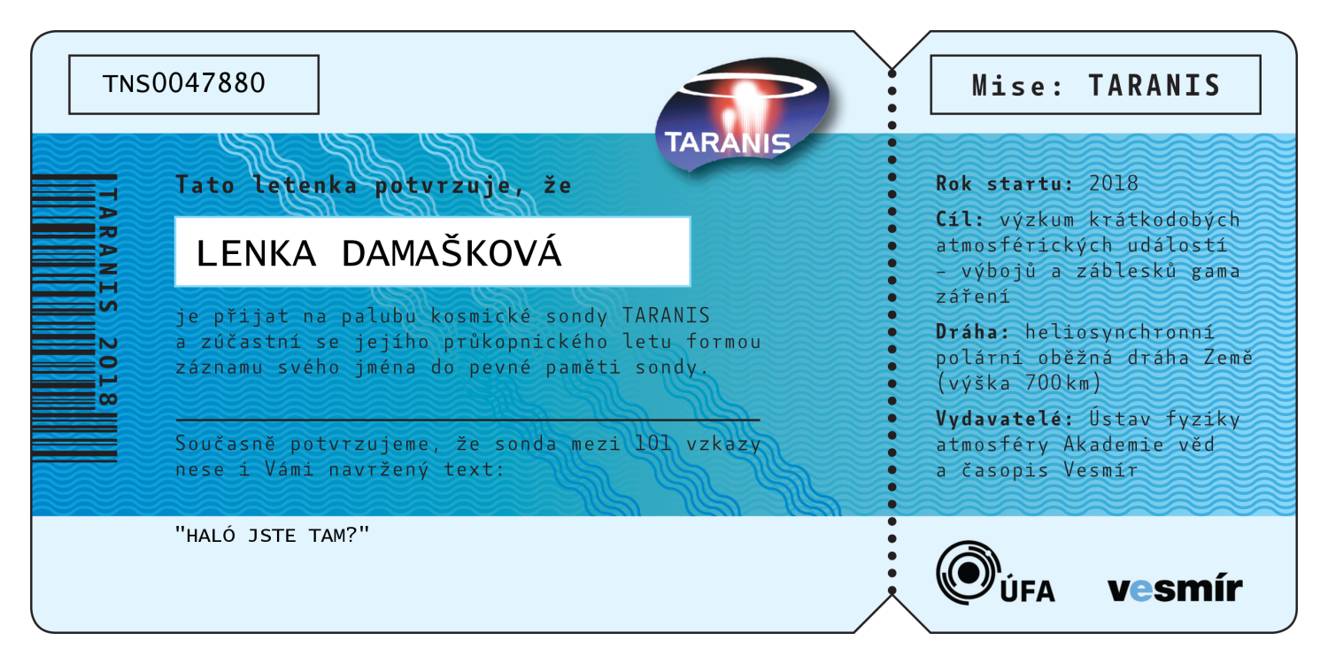 Abecední seznam všech 547 jmen, která jsou (bez diakritiky) nevratně vypálena do paměti sondy TARANIS. Po kliknutí na jméno se vám zobrazí číslovaná letenka na jméno zasilatele, kterou si můžete buď stáhnout do počítače, vytisknout, nebo jednoduše sdílet na sociálních sítích.