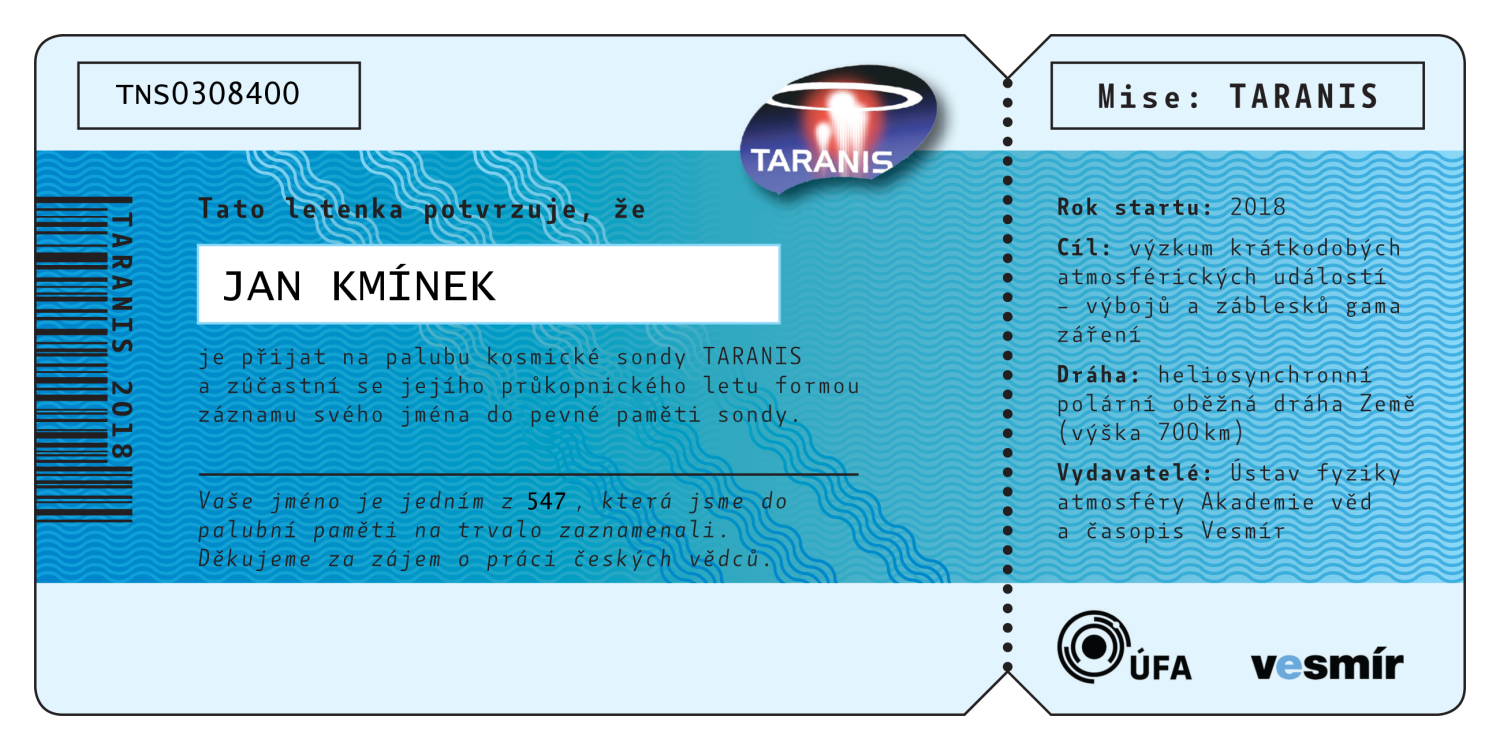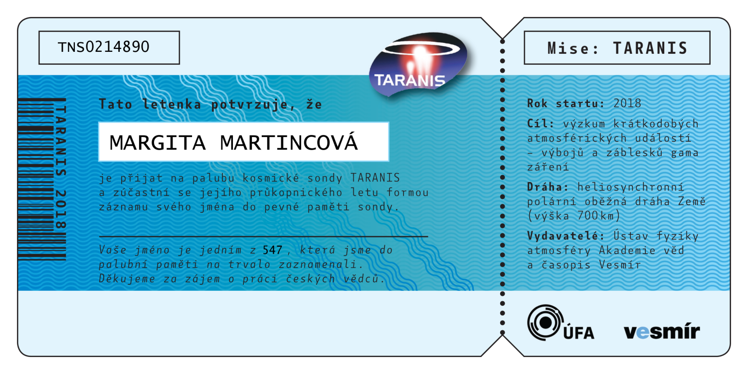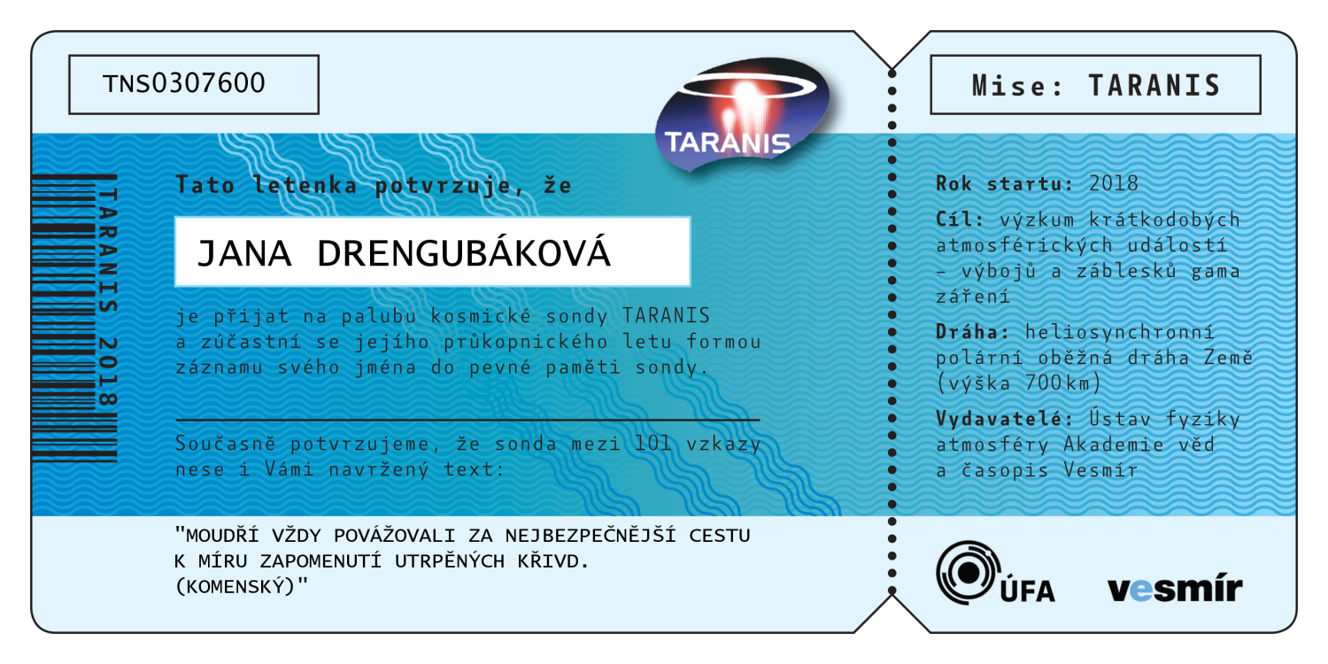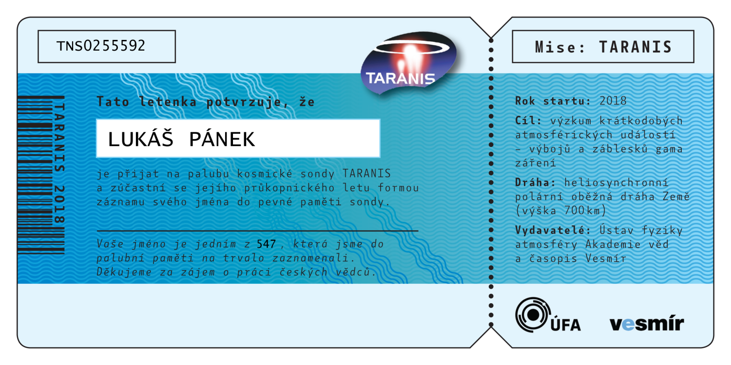 Abecední seznam všech 547 jmen, která jsou (bez diakritiky) nevratně vypálena do paměti sondy TARANIS. Po kliknutí na jméno se vám zobrazí číslovaná letenka na jméno zasilatele, kterou si můžete buď stáhnout do počítače, vytisknout, nebo jednoduše sdílet na sociálních sítích.