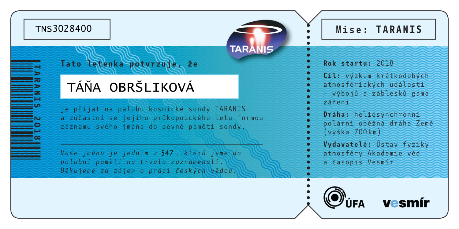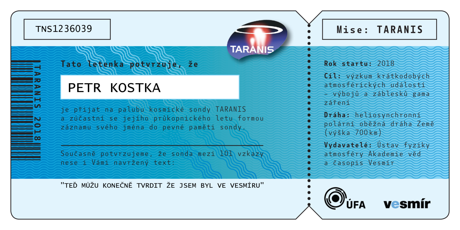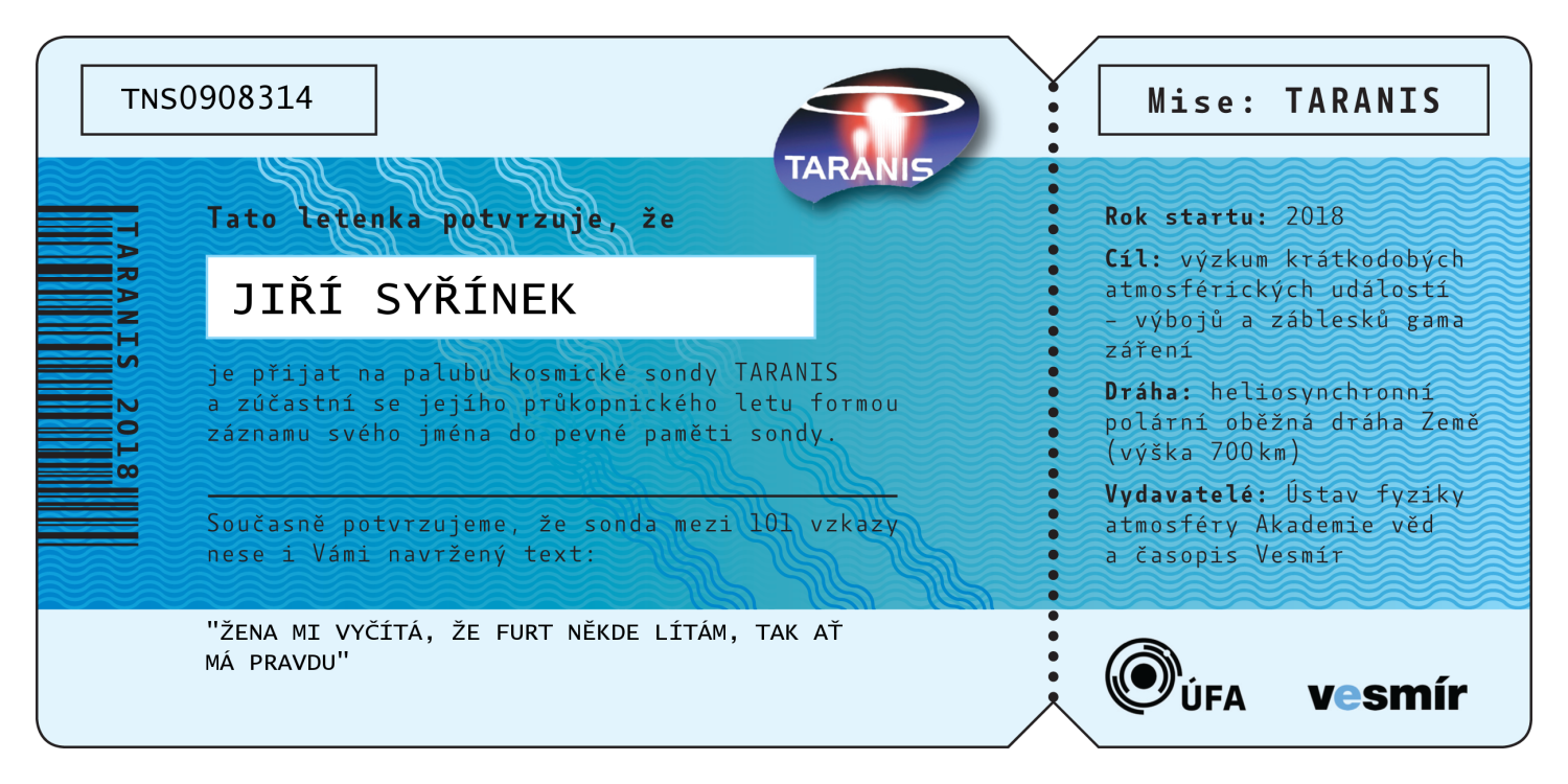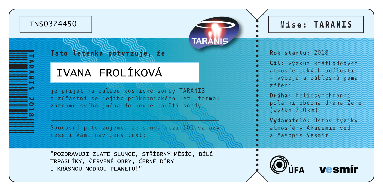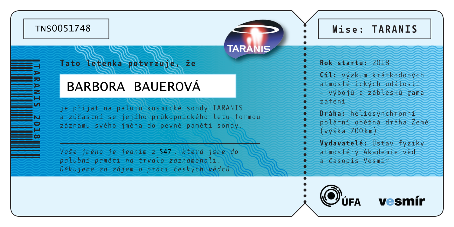 Abecední seznam všech 547 jmen, která jsou (bez diakritiky) nevratně vypálena do paměti sondy TARANIS. Po kliknutí na jméno se vám zobrazí číslovaná letenka na jméno zasilatele, kterou si můžete buď stáhnout do počítače, vytisknout, nebo jednoduše sdílet na sociálních sítích.