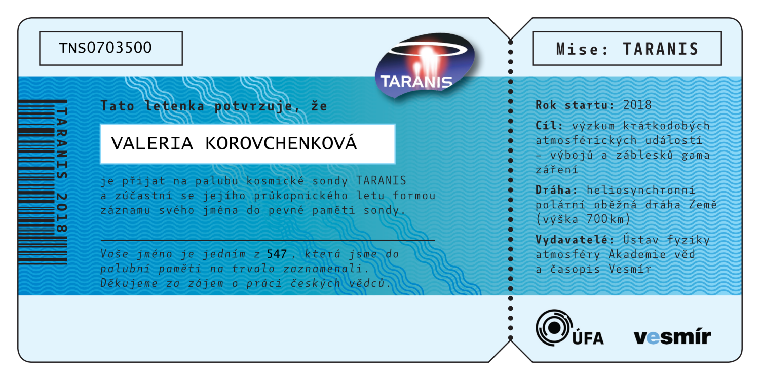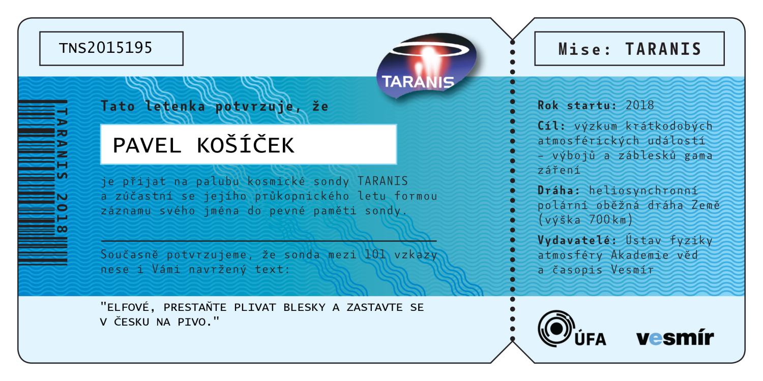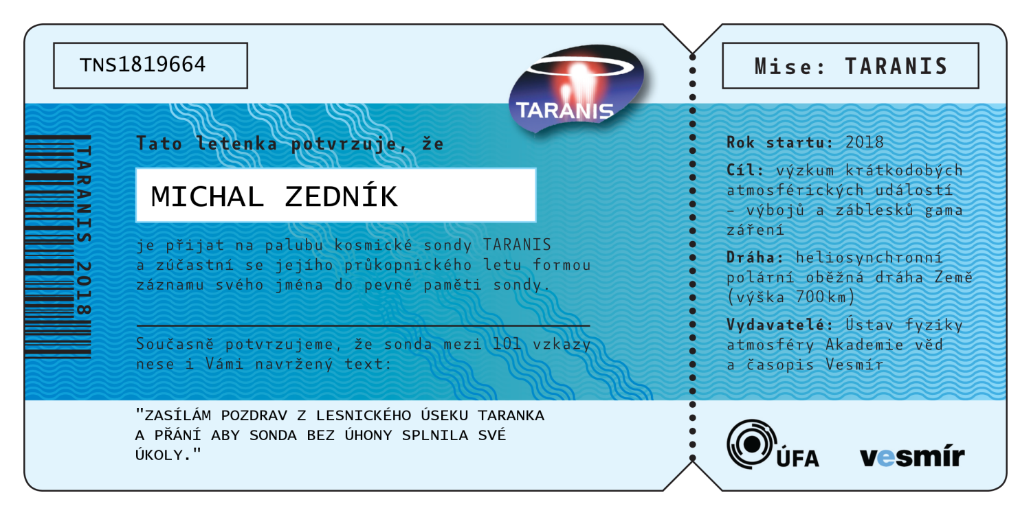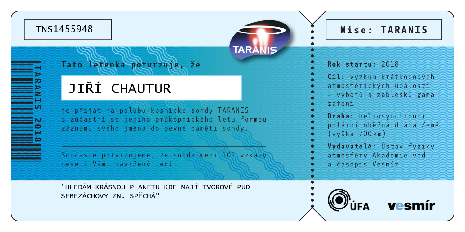 Abecední seznam všech 547 jmen, která jsou (bez diakritiky) nevratně vypálena do paměti sondy TARANIS. Po kliknutí na jméno se vám zobrazí číslovaná letenka na jméno zasilatele, kterou si můžete buď stáhnout do počítače, vytisknout, nebo jednoduše sdílet na sociálních sítích.